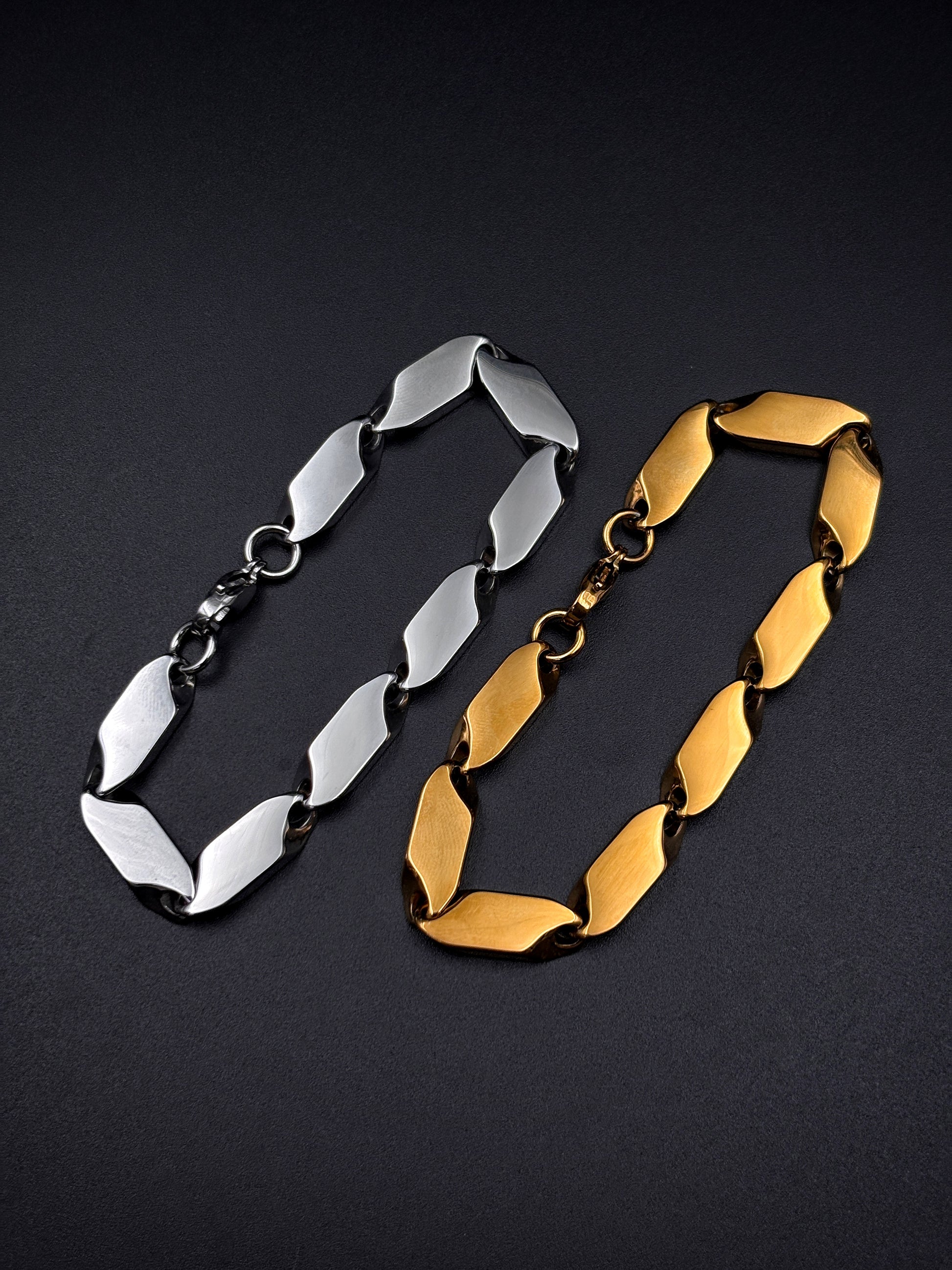 This Rhombus Chain Bracelet features a unique design and a heavy weight, making it a standout piece of jewelry. The universal size ensures a comfortable fit for all. Maximise your style with this versatile piece.